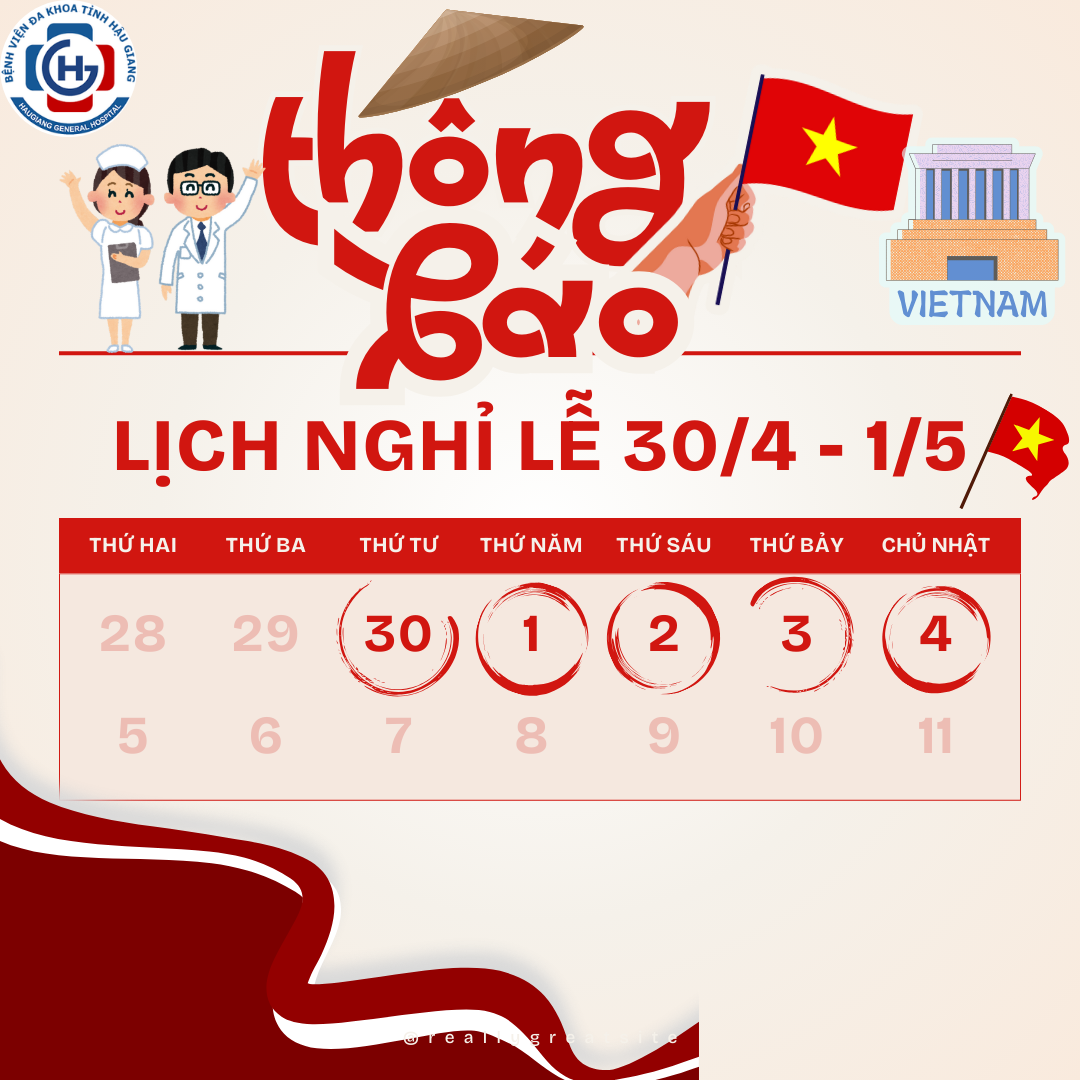Bệnh viện Đa khoa tỉnh Hậu Giang xin thông báo lịch nghỉ lễ ngày Giải phóng Miền Nam 30/04/2025 và Quốc tế Lao động 01/05/2025