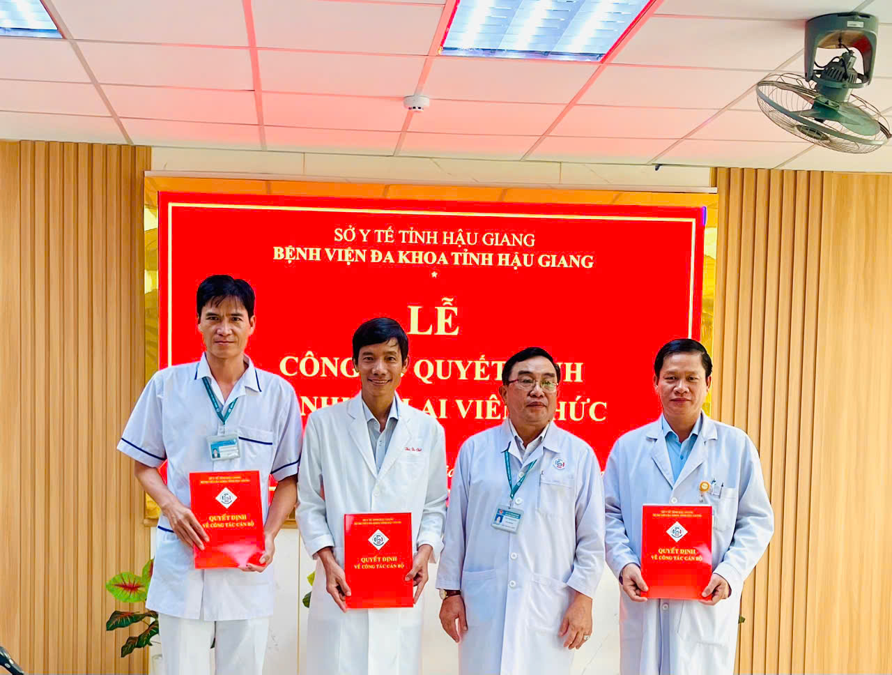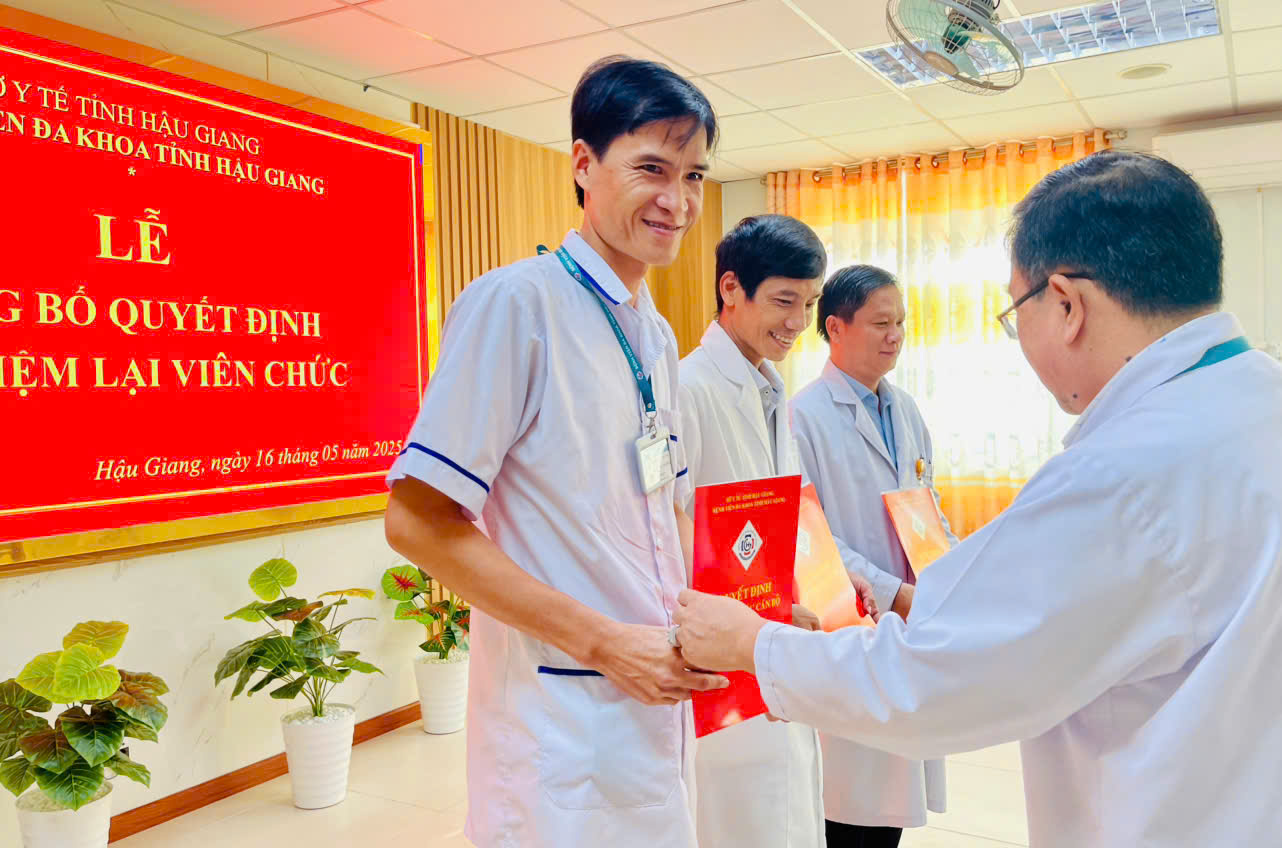 Sáng ngày 16/05/2025, Ban Giám đốc Bệnh viện Đa khoa (BVĐK) tỉnh Hậu Giang tổ chức lễ công bố quyết định bổ nhiệm lại đối với các viên chức giữ chức vụ lãnh đạo của Khoa/Phòng thuộc BVĐK tỉnh. Đồng chí Trần Thanh Giang, Bí thư Đảng ủy - Phó Giám đốc phụ trách điều hành Bệnh viện dự và chủ trì buổi lễ.