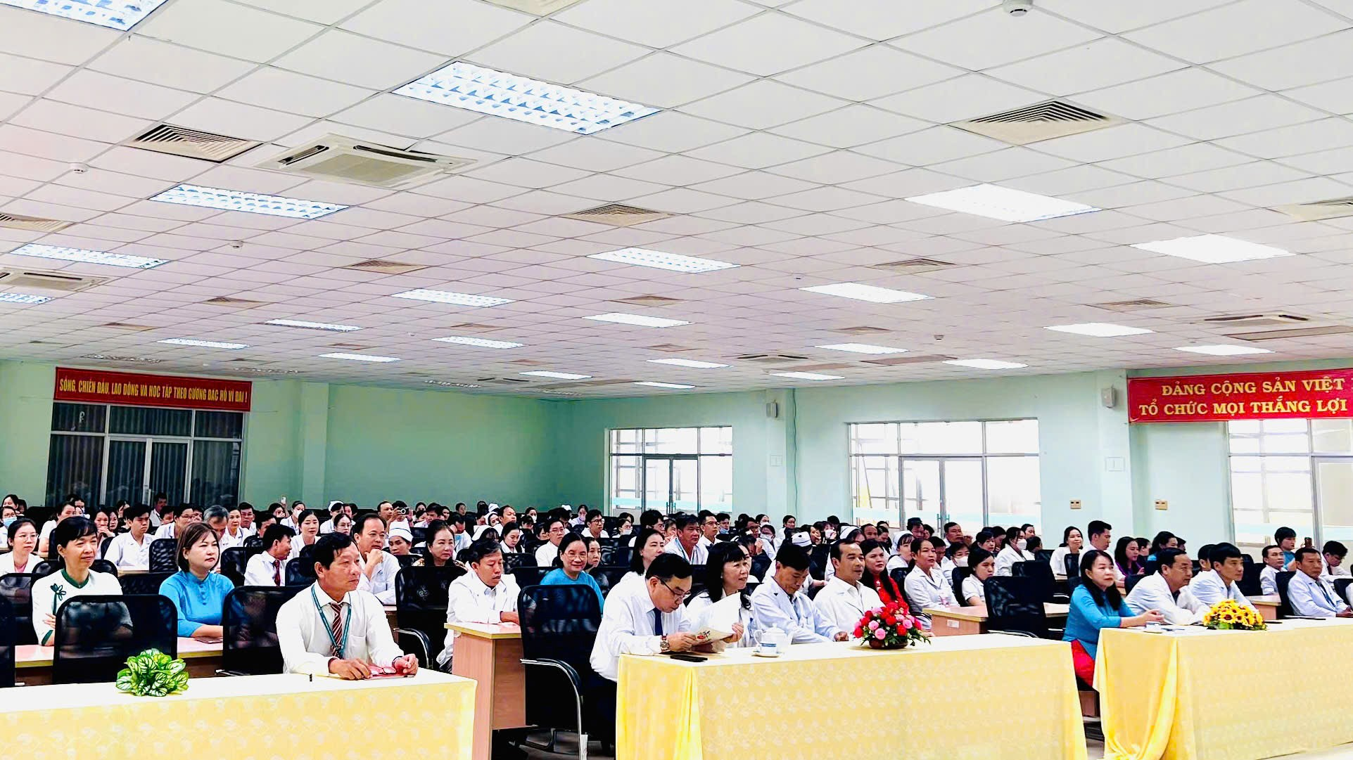 Tham dự buổi lễ có Bs.CKII Trần Thanh Giang - Bí thư Đảng ủy, Phó Giám đốc phụ trách điều hành bệnh viện; Bs.CKII Võ Thị Trúc Phưa - Phó Giám đốc, Chủ tịch Công đoàn cơ sở; cùng quý đại biểu là Ủy viên Ban Thường vụ, Ban Chấp hành Đảng ủy, Ban Chấp hành Công đoàn, Đoàn Thanh niên, lãnh đạo các khoa/phòng và toàn thể viên chức, người lao động của bệnh viện.