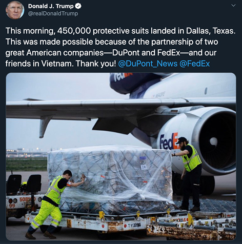 "Sáng nay, 450.000 bộ đồ bảo hộ đã đến Dallas, Texas. Điều này đã trở thành hiện thực nhờ sự hợp tác giữa 2 doanh nghiệp tuyệt vời của Mỹ - DuPont và FedEx - cùng những người bạn Việt Nam của chúng ta. Xin cảm ơn!", ông Trump viết trên Twitter ngày 9-4.
