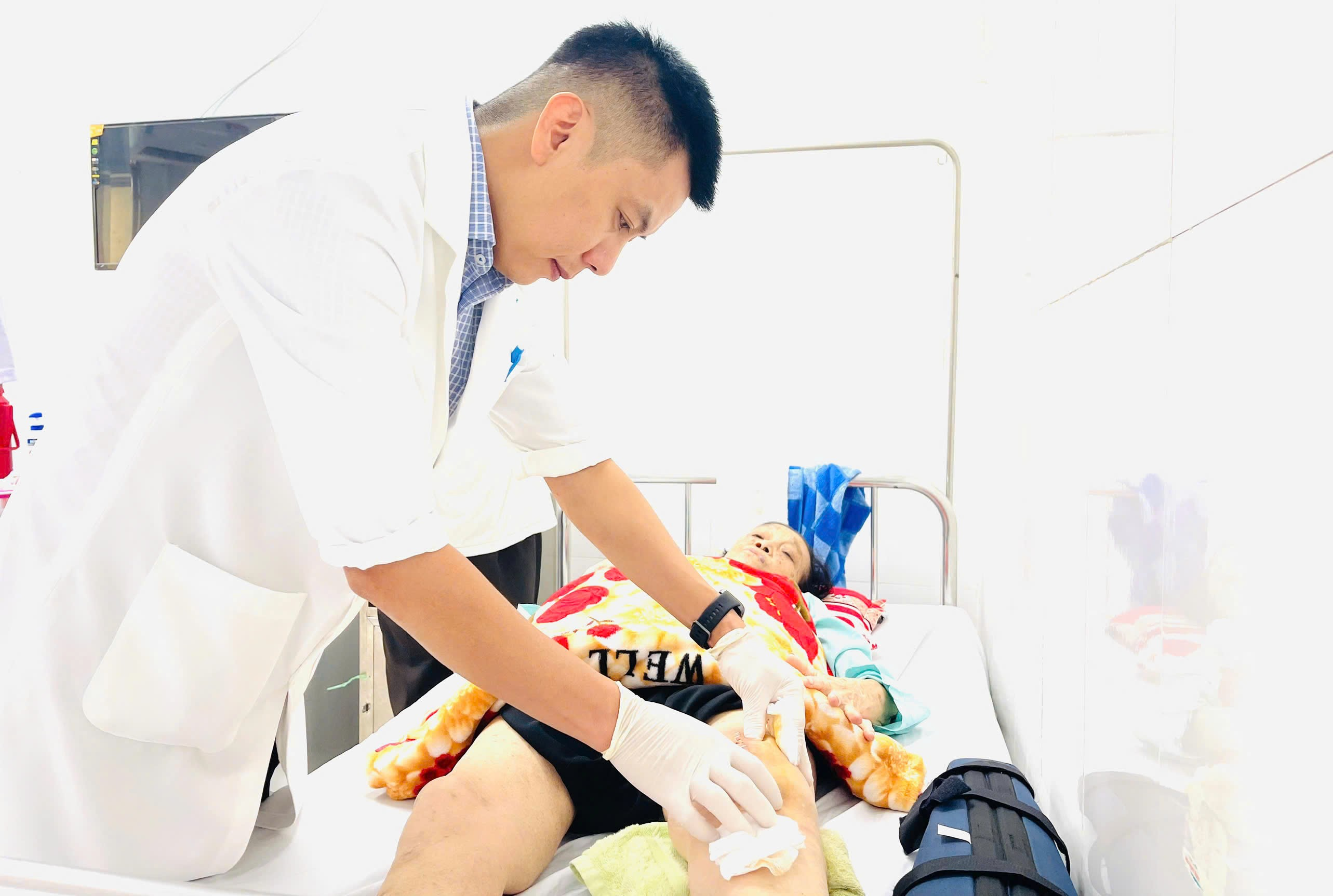 Bs.CKI Võ Lý Thanh Đăng - Trưởng Khoa Ngoại Chấn thương, BVĐK Hậu Giang thăm khám cho bệnh nhân sau phẫu thuật