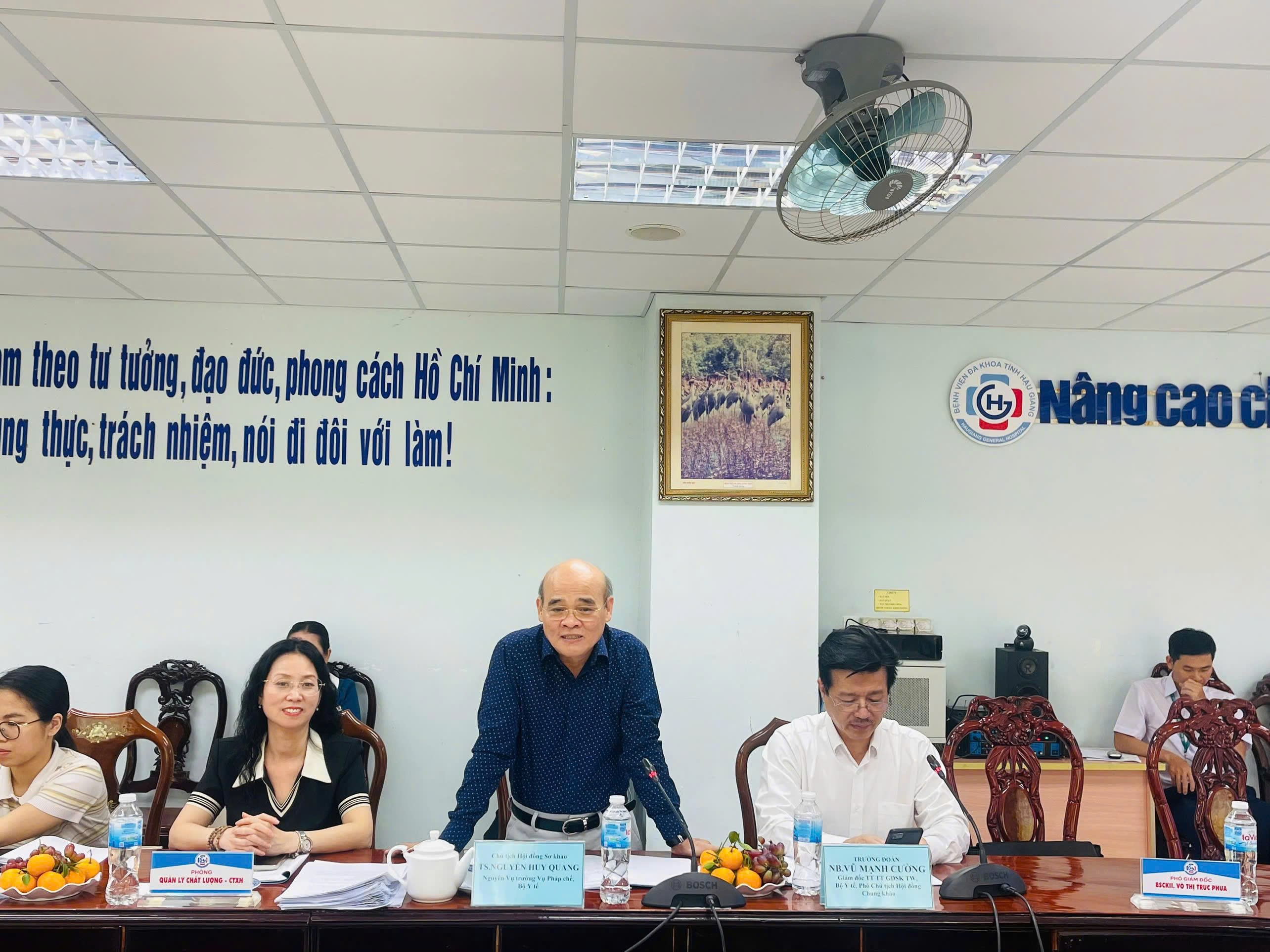 Bs.CKII Võ Thị Trúc Phưa - Phó Giám đốc, Trưởng Ban Chỉ đạo Phòng chống tác hại thuốc lá đã báo cáo chi tiết về các hoạt động, chương trình truyền thông, biển báo, khu vực cấm thuốc và các biện pháp hỗ trợ nhân viên, bệnh nhân duy trì môi trường bệnh viện không khói thuốc.
