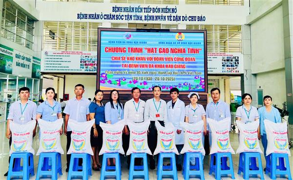 Sáng ngày 14/10/2025, Ban Giám đốc phối hợp cùng Ban Chấp hành Công đoàn cơ sở Bệnh viện đa khoa Hậu Giang đã tổ chức chương trình “Hạt gạo nghĩa tình” trao tặng 1,6 tấn gạo cho 28 Tổ Công đoàn với hơn 470 đoàn viên. Tổng trị giá quà tặng hơn 25 triệu đồng do Công ty TNHH MTV XSKT Hậu Giang tài trợ.