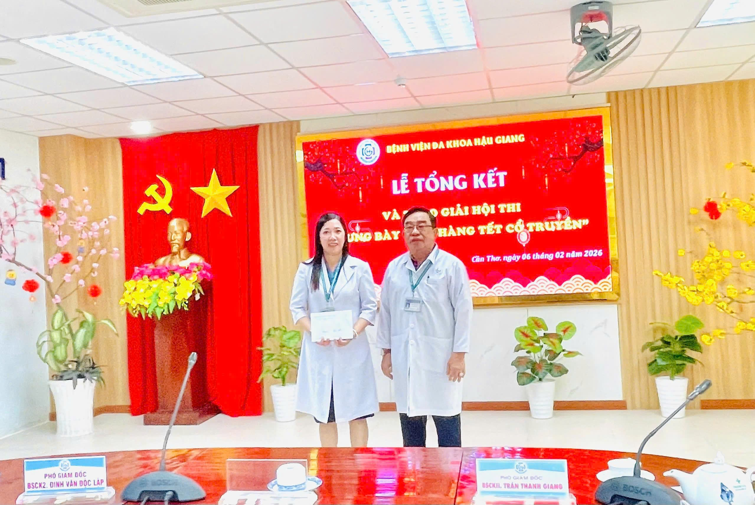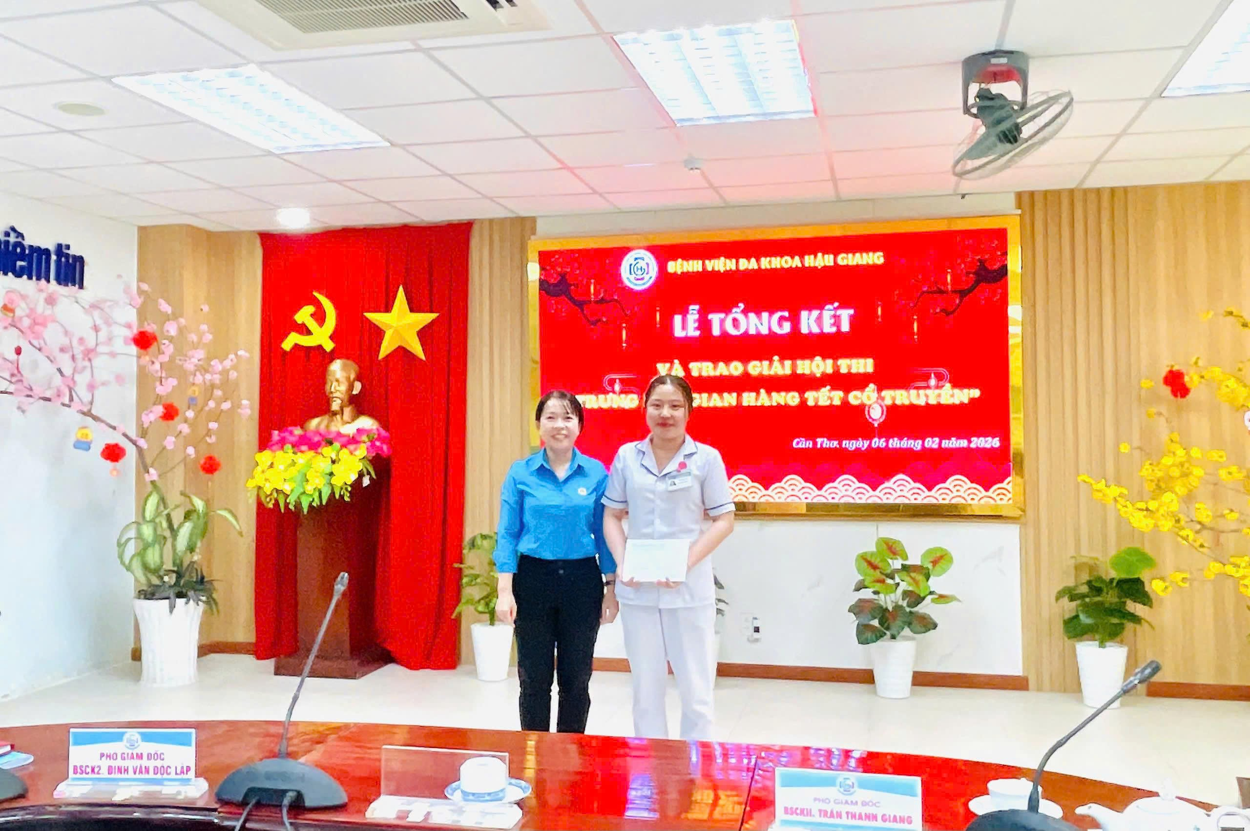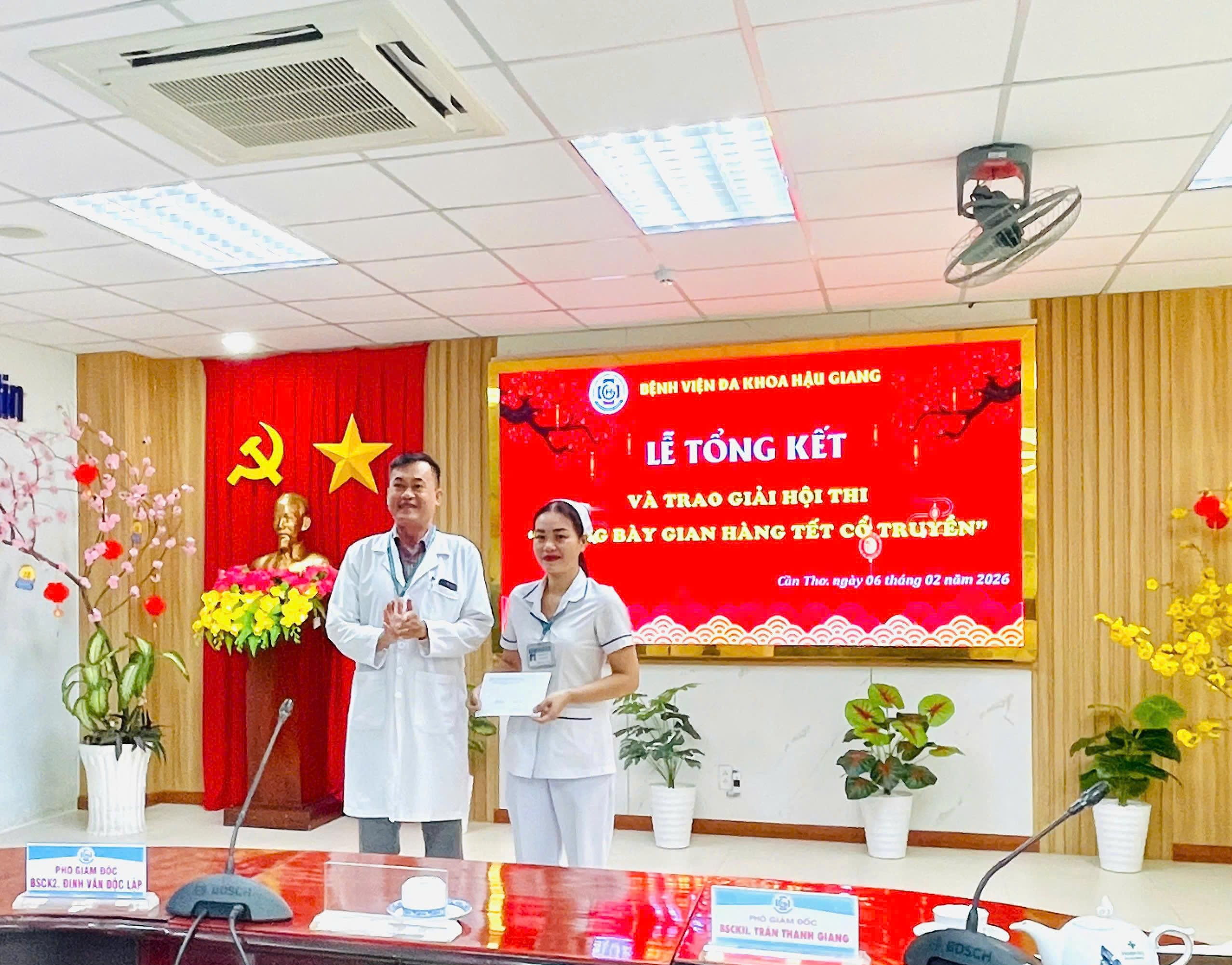 Dịp này, Công đoàn cơ sở Bệnh viện Đa khoa Hậu Giang cũng tổ chức trao giải Hội thi trưng bày gian hàng Tết cổ truyền năm 2026. Kết quả, Ban Tổ chức đã trao 04 giải Khuyến khích, 01 giải Ba, 01 giải Nhì và 01 giải Nhất cho các Tổ công đoàn tham gia. Hội thi là hoạt động ý nghĩa, góp phần giữ gìn và phát huy nét đẹp văn hóa truyền thống ngày Tết, đồng thời tạo không khí thi đua sôi nổi, tăng cường đoàn kết, giao lưu giữa các khoa, phòng trong toàn bệnh viện.