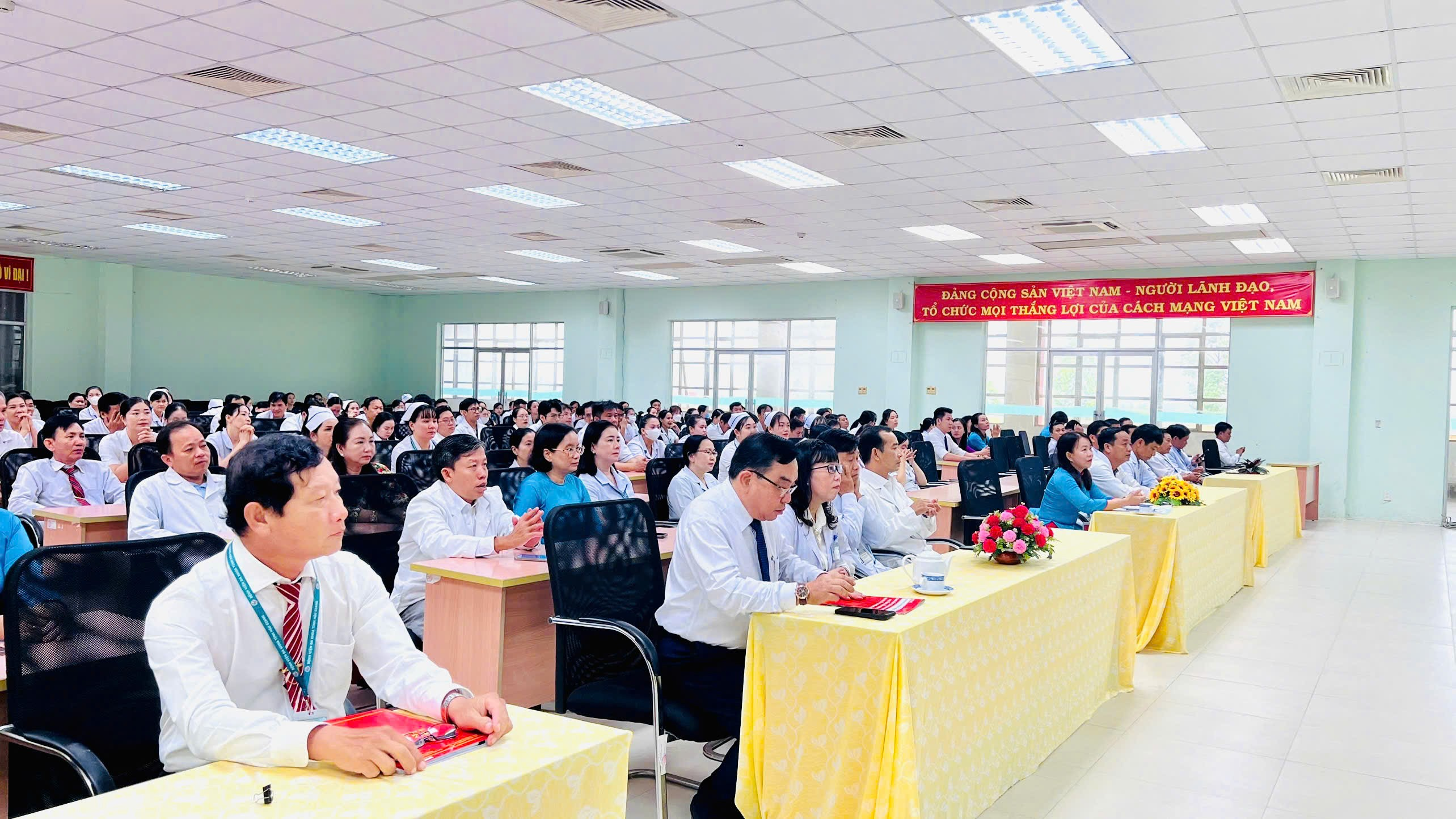 Tham dự buổi lễ có Bs.CKII Trần Thanh Giang - Bí thư Đảng ủy, Phó Giám đốc phụ trách điều hành bệnh viện; Bs.CKII Võ Thị Trúc Phưa - Phó Giám đốc, Chủ tịch Công đoàn cơ sở; cùng quý đại biểu là Ủy viên Ban Thường vụ, Ban Chấp hành Đảng ủy, Ban Chấp hành Công đoàn, Đoàn Thanh niên, lãnh đạo các khoa/phòng và toàn thể viên chức, người lao động của bệnh viện.